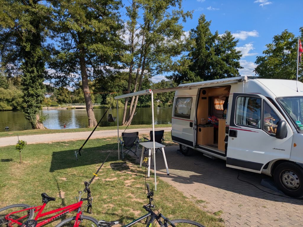 Wegen eines größeren Staus auf der Autobahn entschliessen wir uns auf der Rückfahrt von Bad Mergentheim zu einem kleinen Roadtrip overland, durch den Spessart an den Main. Das Wetter ist schön und wir haben Zeit und vieles ist besser als im Stau auf der Autobahn zu stehen. Während wir also gemütlich den Main entlang zuckeln, kommen wir am Aqua Camping bei Klingenberg vorbei, ein Platz, den wir auch schon länger auf der Agenda für einen kommenden Aufenthalt haben. Warum heute nicht einfach mal hier anhalten und schauen? Ein persönliches Bild ist wesentlich besser als jede Online-Rezension. Gesagt getan, runter von der Bundesstrasse, die freundliche Rezeptionisten lässt uns frei Hand bei der Besichtigung. Die wenigen wirklichen Flußplätze für Touristencamper (der Rest fest in der Hand von Dauercampern) sind wirklich sehr schön und gepflegt, auch der Biergarten lacht uns mit seiner originellen Speisekarte (u.a. Weißwurst-Salat) an, zumindest für einen Nachmittags-Snack ist genug Zeit. Während wir also auf der Terasse sitzen und lecker speisen, überlegen wir Optionen für das kommende Wochenende hierher zu kommen, aber wie so oft sind am Fr./Sa. die besten Plätze ausgebucht. Tausende wenn-danns und entweder-oder später bringt Su einfach eine weitere Option ins Spiel: Warum nicht einfach heute Abend noch hier bleiben? Das Wetter ist gut, ein Premium-Platz ist frei, die Speiskarte lockt u.a. noch mit einem Kochkäse-Schnitzel und der restliche Heimweg morgen früh nach Frankfurt ist nicht sehr weit… Deal! Wir bleiben einfach hier!