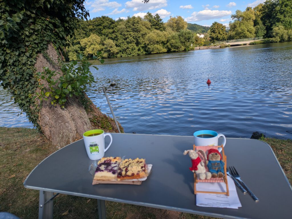 Von der Bäckerei unterwegs haben wir Pflaumenkuchen gekauft, den es eigentlich auf dem heimischen Sofa zum Wochenend-Abschluß geben sollte, jetzt gibt es den hier für die Verlängerung, direkt am Mainufer: