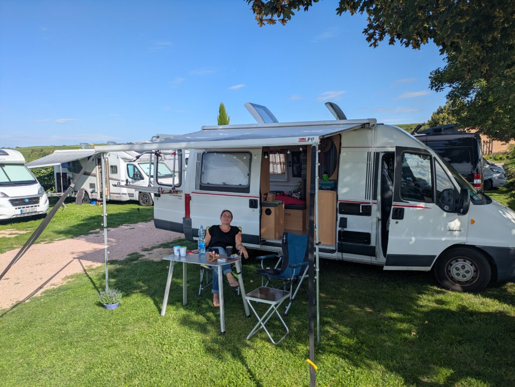 Weniger als eine Stunde Fahrt, das Wetter ist heiß und sonnig, schon um 1 machen wir uns auf den kurzen Weg. Kurz noch im AWG und Kaufland shoppen (enttäuschend) und dann sind wir da. WIrklich ein sehr gepflegtes Weingut mit einem großen Stellplatz, 25 WoMos, unser Eckplatz sehr schön mit Blick auf den Liebeshügel (und in einiger Entfernung ist sogar die Frankfurter Skyline erkennbar…)