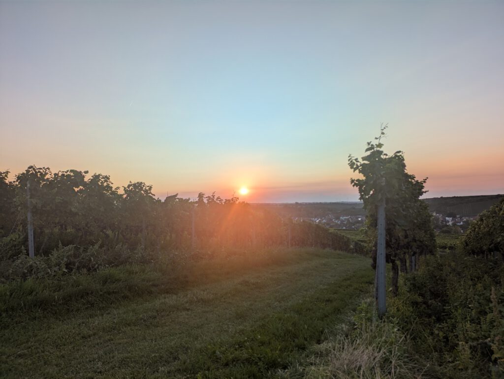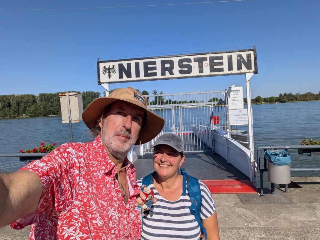 Schnell ist alles aufgebaut, noch sind viele Plätze frei, aber im Lauf des Nachmittags füllt es sich bis auf den letzten Platz. Wir lungern etwas rum, geniessen das Wetter und die Aussicht, machen uns aber am frühen Abend mit den Rädern auf den Weg runter nach Nierstein, etwas den Ort anschauen und extrem lecker Vietnamesisch zu Abend essen. Zurück geht es am Ende recht steil den Weinberg hinauf, trotzdem aber gut zu radeln. Ein sehr chilliger Abend mit tropischen Temperaturen bis spät in die Nacht, trotzem schlafen wir herrlich.